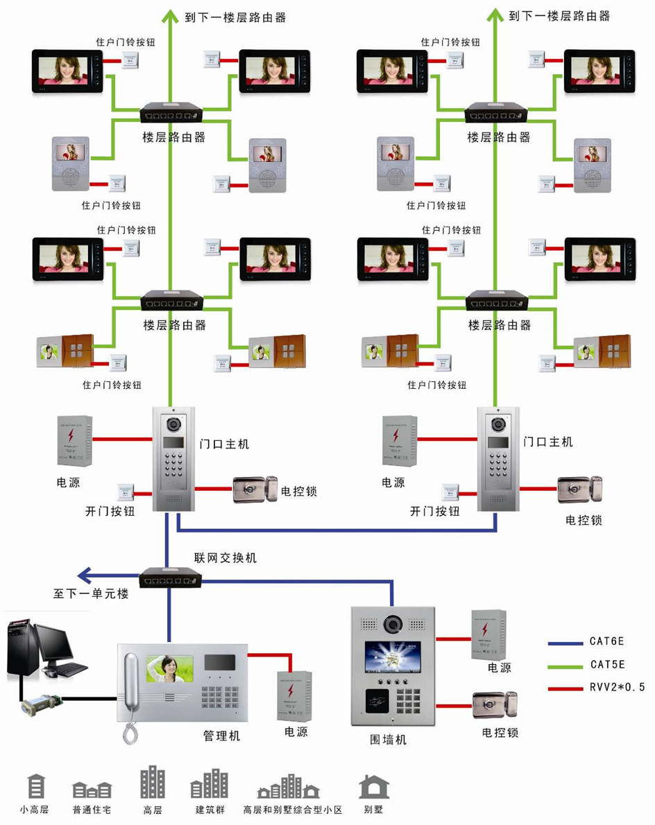 樓宇對講,即在多層或高層建筑中實現(xiàn)訪客、住戶和物業(yè)管理中心相互通話、進行信息交流并實現(xiàn)對小區(qū)安全出入通道控制的管理系統(tǒng),俗稱樓宇對講系統(tǒng)。